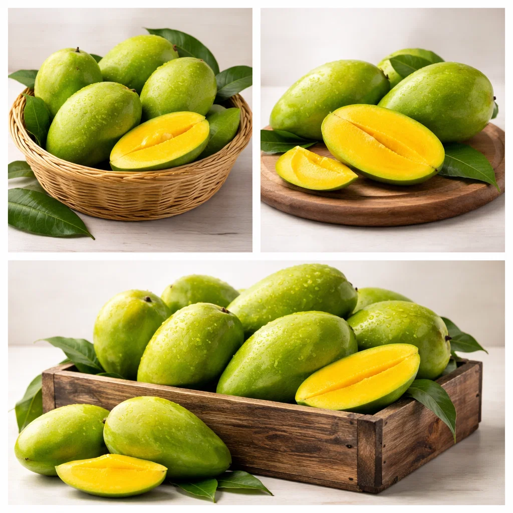 These mangoes are small to medium size and have a cool oval shape with a pointed tip. What’s really cool is that they stay green on the outside even when they’re ready to eat! Most mangoes turn yellow, but Langra mangoes keep their greenish color during ripening.